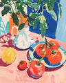 Tomatoes on Table with Greenery